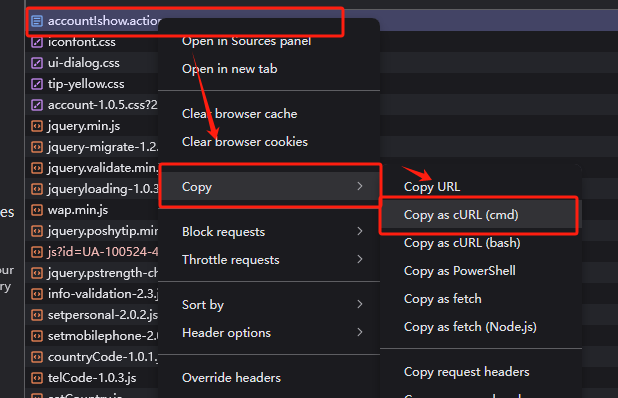 2.4 右键请求 Copy → Copy as cURL