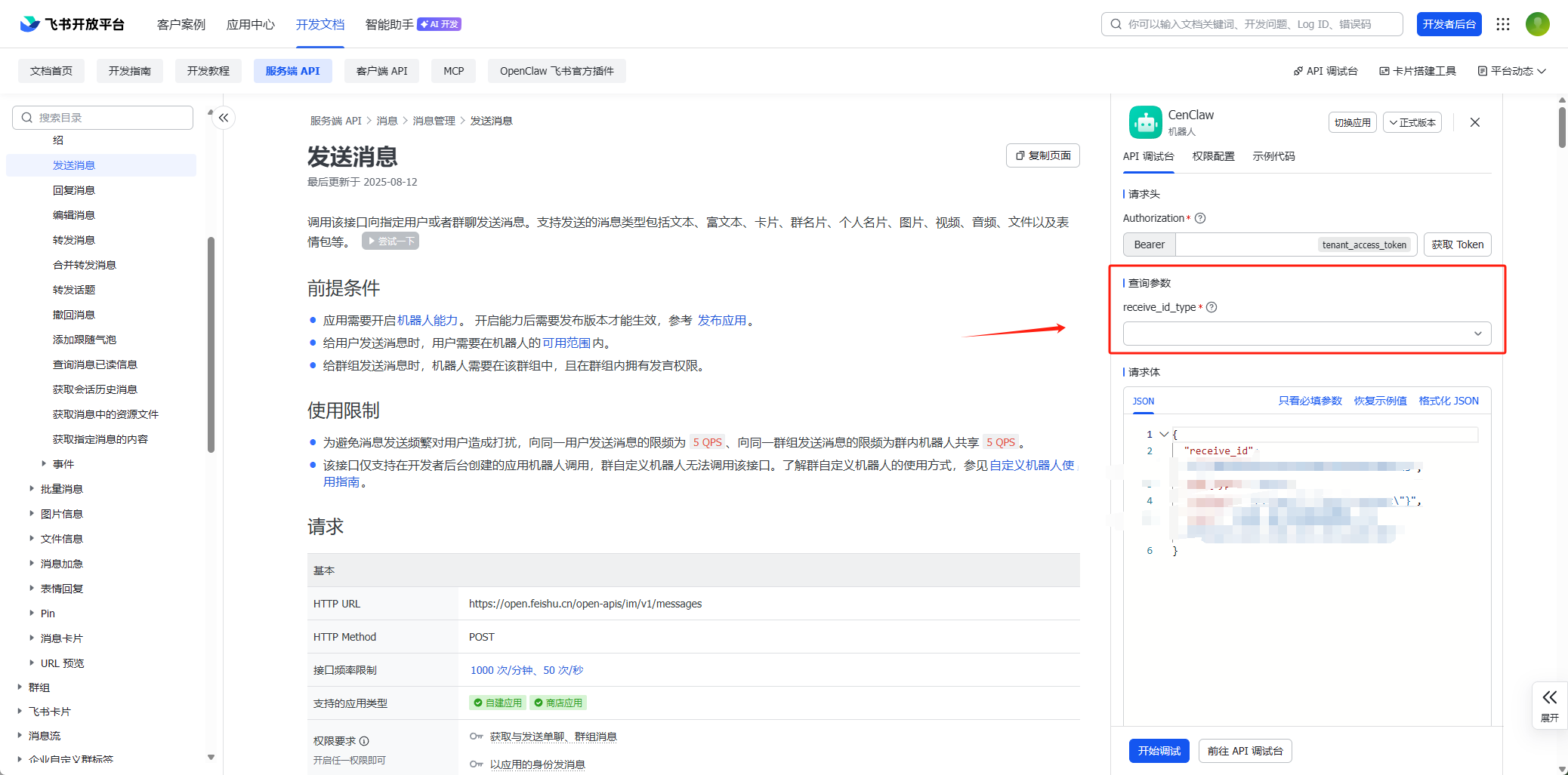 其实还是很简单的,我们只要去登录 API 调试台,找到发送消息接口。这里有一个请求头: