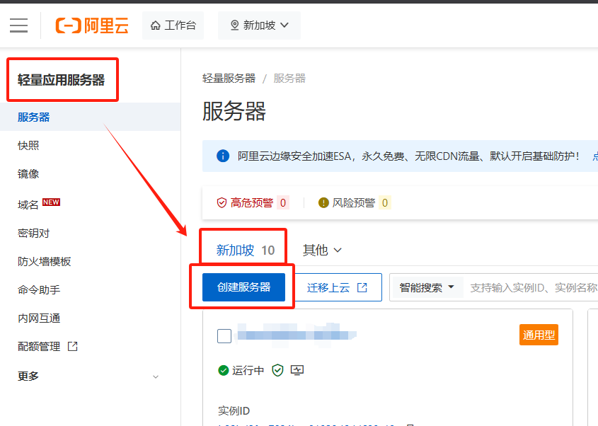 由于是无敌小白版,所以会从阿里云服务器的选购开始,配置的话,由于整个服务很轻量,所以配置要求不需要很高,选购一个最基础的阿里云服务器,我们直接进入到 轻量应用服务器 > 创建服务器;这里地区我一般会喜欢选择新加坡,一个是因为我本身在国外访问起来比较快,另一个原因是 如果是国内的服务器, Github有可能访问不了。