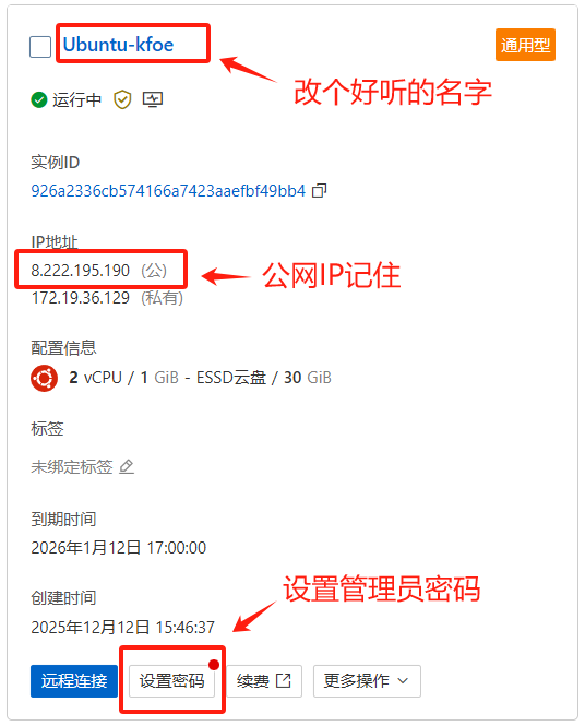 然后我们得到了一个服务器,这里其实主要注意3个事情:把名字给改了,不然的话,后来你根本不知道这个服务器是干什么的,然后公网IP这里的 8.222.195.190 我们记住,在下面的绑定域名步骤我们会用到,然后就是设置密码,这里的密码是我们的超级用户的密码,我们在下面会用到这个超级用户,所以这里要设置一下超级用户的密码。