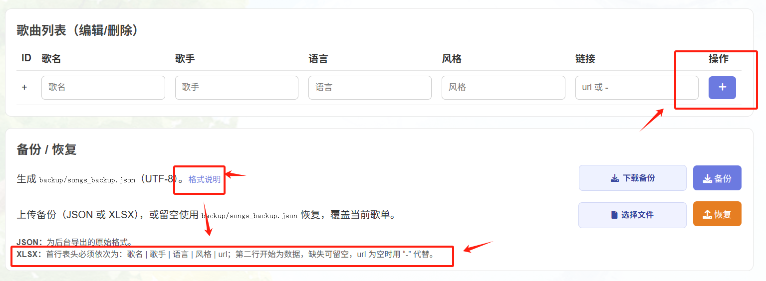 支持手动输入,也支持xlsx恢复备份,但是要注意xlsx的格式(歌名 | 歌手 | 语言 | 风格 | url),第一行的表头,第二行开始是数据: