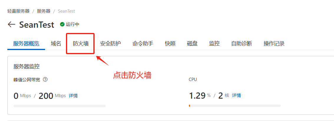 我们进入到管理页面,我们进入防火墙,(我们需要开放一些端口给我们的服务,不然我们不能从外面用到这些服务),