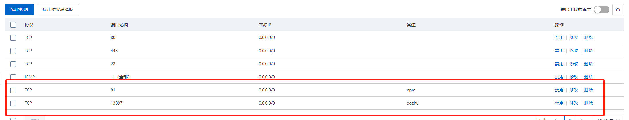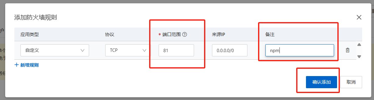 点击添加规则,我们需要放两个端口,13897(QQZhu)和 81(npm) :