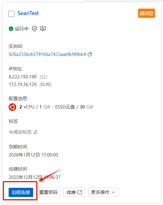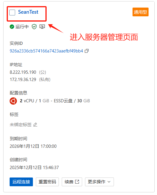 在 创建服务器列表,我们直接选用34元的通用型(有28元的,但是那个内存是0.5GB,有点太寒酸了。)(还有现在的服务器真是贵的离谱啊,这里我真是感谢各种储存的涨价了。)