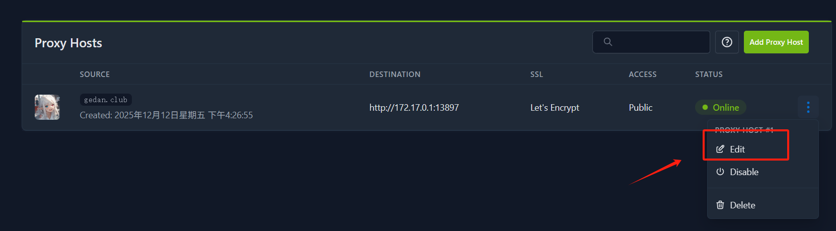 点击 Add Proxy Host: