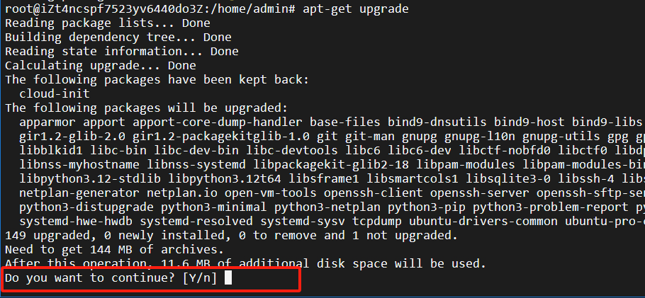 apt-get upgrade出现这个的时候,直接回车就可以了,默认的是 [Y]: