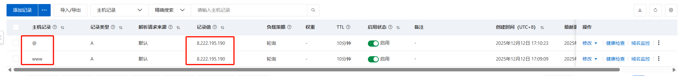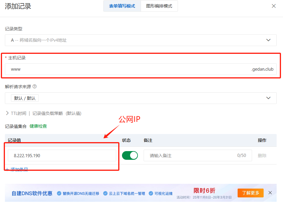 然后添加记录,主要添加 www 和 @: