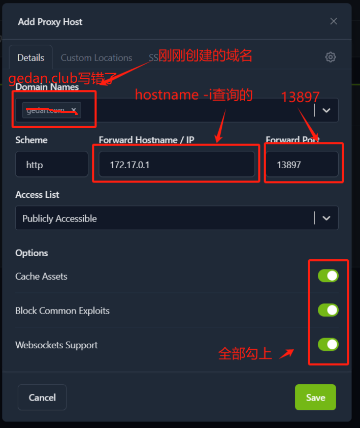 得到一个IP地址 172.17.0.1,这个我们会用到,然后回到刚刚的Add Proxy Host界面: