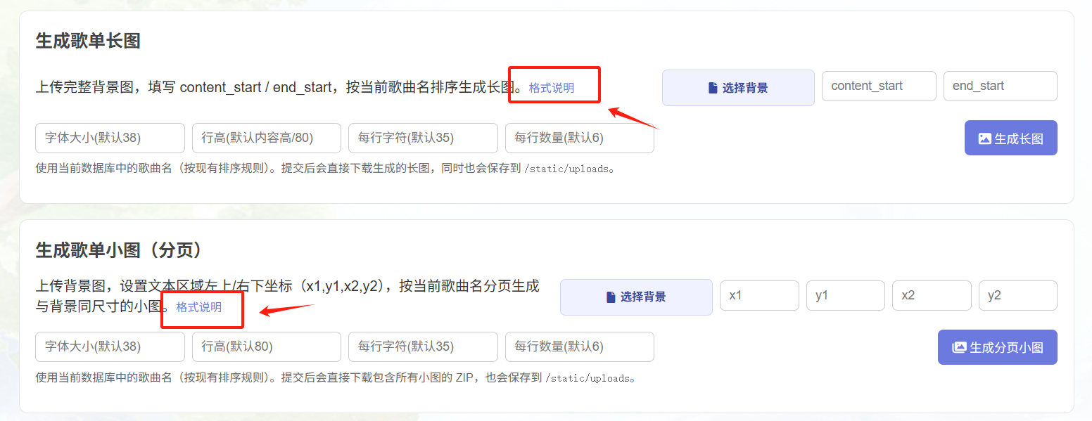 长图 和 分页小图 都有自己的格式说明,按照相应的输出即可,字体大小、行高、每行字符、每行数量用默认的即可。
