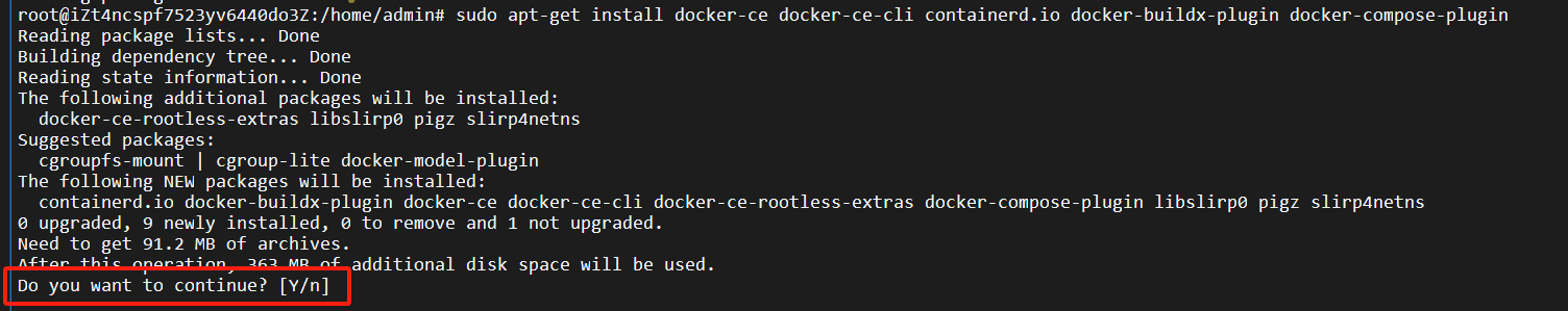 sudo apt-get install docker-ce docker-ce-cli containerd.io docker-buildx-plugin docker-compose-plugin这里一样,选择 [Y]: