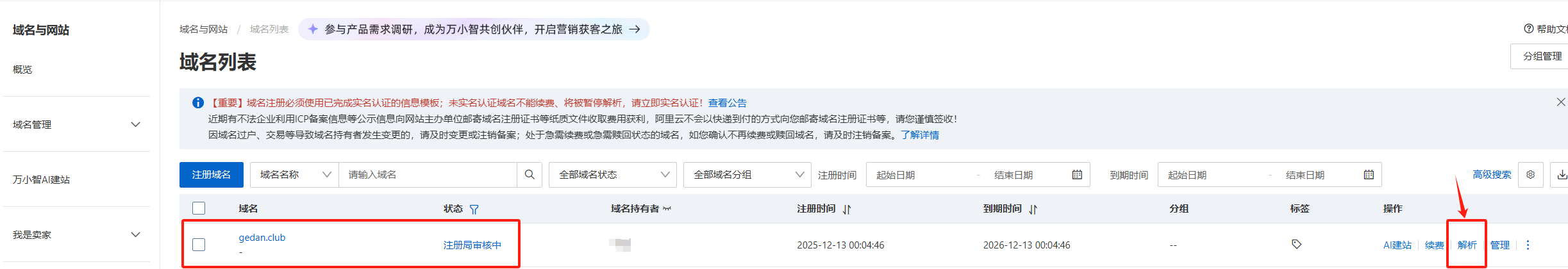 我们直接进来点解析,这种.club的小域名可能需要审核一段时间,但是不重要,我们直接来解析: