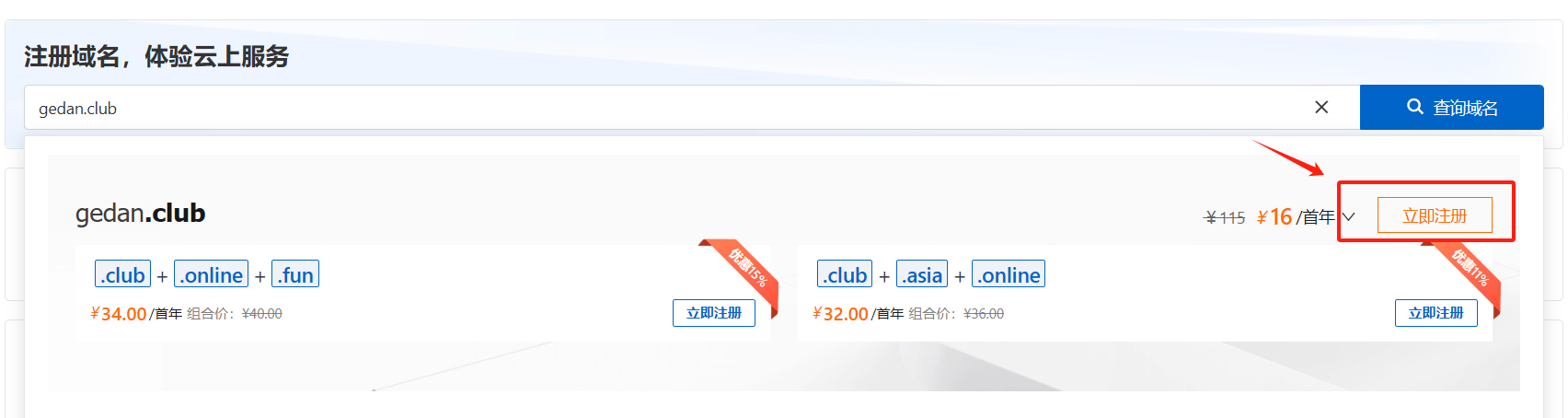 我这里直接查询了一下 "gedan.club"这个域名,发现16元/首年,大家查询域名的时候,买一个差不多的就可以了首年几十元,然后后续100-200元左右的域名就可以了,没有必要那么贵的,除非你特别喜欢。