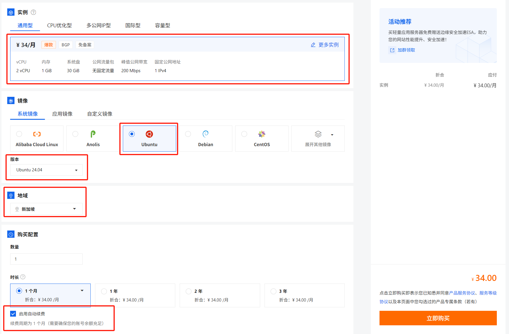 镜像的话选择 Ubuntu 就可以,版本选择 Ubuntu 24.04,地域 新加坡(这里必须使用新加坡,不然后面Github会很麻烦), 是否启用自动续费看个人,我一般是会启动的。